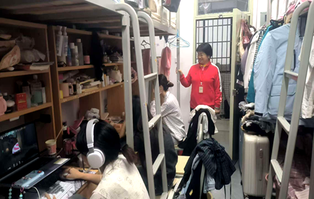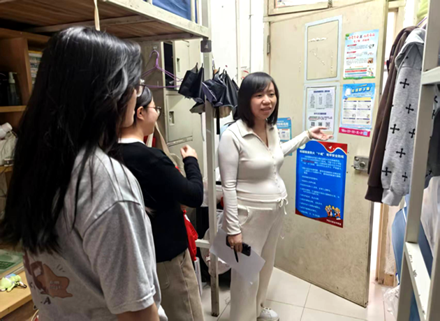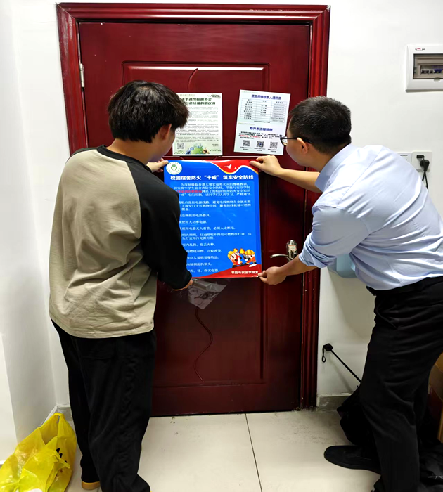 二级学院领导分头行动:汪泽平带队查5 栋,徐娟深入 3 栋,学院副书记袁圆、副院长杨帆、卢东亮分别赴4 栋、2 栋、行政楼 3 楼,深入每一间宿舍,粘贴《校园宿舍防火“十戒”筑牢安全防线》宣传单,重点检查违规电器、用电线路、易燃易爆物品、消防设施及内务,现场指导整改。