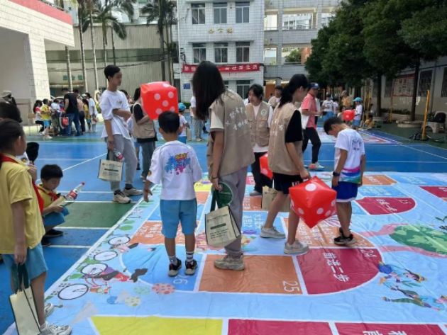 游戏区也是热火朝天,孩子们开心地玩着游戏,学习相关环保知识。如“飞行棋”游戏需要参与者投掷骰子,根据骰子数字移动到指定位置,回答所处位置关于垃圾的分类问题;模拟垃圾分类投放游戏则需要参与者将不同的“垃圾”进行分类投放,完成游戏通关者可兑换小礼品。