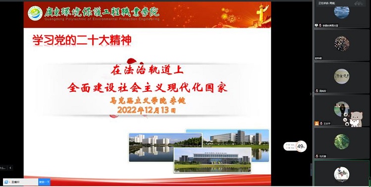 12月13日下午,学校党的二十大精神宣讲团成员、法学硕士、副教授李健以网课形式给第二党总支全体党员宣讲党的二十大精神,报告主题为在法治轨道上全面建设社会主义现代化国家。