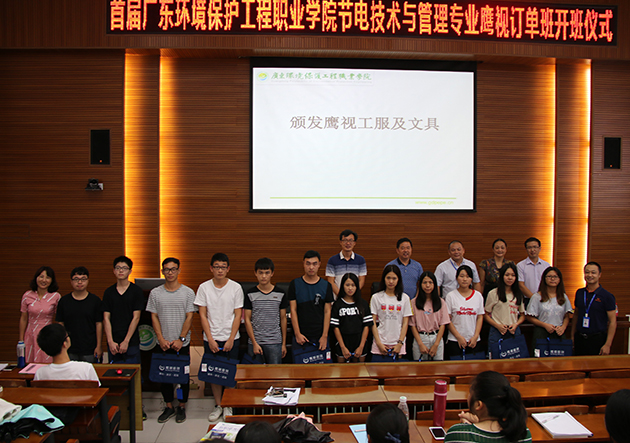 9月26日上午,我院首届节电技术与管理专业鹰视订单班开班暨捐赠仪式在教学楼116举行。院长孙水裕,广东鹰视能效科技有限公司总经理梁敬枝、首席行政官秦育宣,相关部门负责人参加仪式。