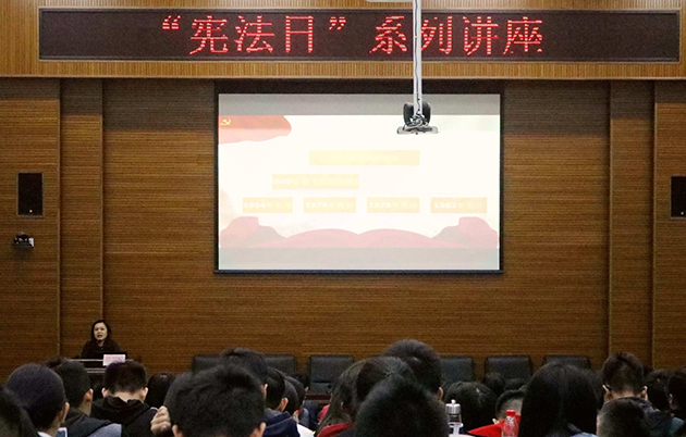 在第四个“国家宪法日”来临之际,为深入贯彻党的十九大精神,维护宪法权威,坚持中国特色社会主义法治道路,进一步增强学生法治观念,12月6日晚,我院举行“国家宪法日”讲座,500多名学生聆听了讲座。