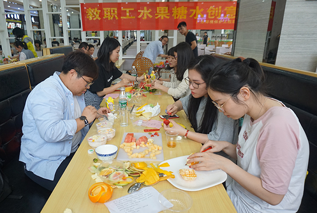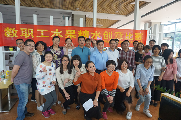 4月19日下午,学院工会在饭堂一楼举行了“教职工水果糖水创意比赛”。院长孙水裕,相关部门负责人参加活动,为参赛队伍加油助阵。