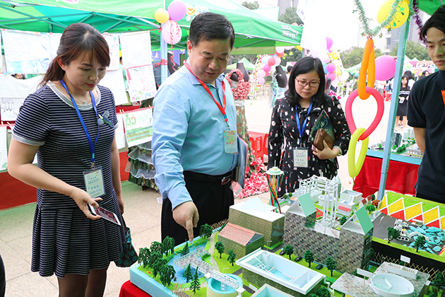 循环经济与低碳经济系的模拟人工湿地装置、人体感温风扇、六足机器人、电梯优化系统装置、虹膜识别加密系统、冷凝水回收装置、环保时装展等作品吸引众多师生前来参观。机电工程系自主研发的楼层智能灯光控制系统、广州塔、电动小车、音乐盒、温度室内报警器等作品,充分体现了学生学以致用,乐于实践的精神。生态环境系自主研发的微景观植物墙、自主设计的温室盆栽、3D立体压花画等创新创业产品吸引了众多师生围观。环境科学系通过演示VR眼镜游戏、安全心肺复苏急救等展现专业风采,无人机和巨幕显示器更是吸引了众多师生的围观。环境监测系展示班服设计大赛的作品、简约的水净化仪器、神奇的现场实验、充满诚意的清新剂展示科技的魅力。