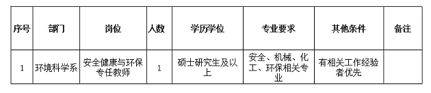 因工作需要,学院现面向社会招聘环境科学系教师1名。