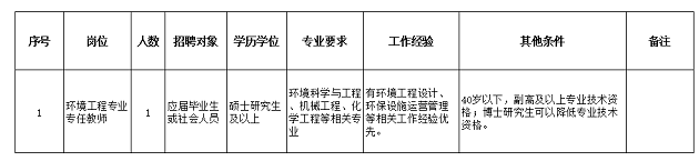 因工作需要,学院现面向社会招聘环境工程专业专任教师1名。