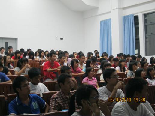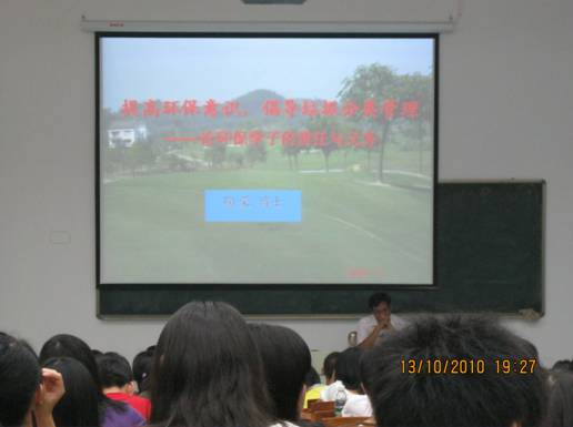 “环境保护与资源综合利用,举国关注;哥本哈根气候大会——节能减排,世界瞩目”。鞠荣博士一路娓娓道来,从我国城市生活垃圾日益增加,垃圾污染日趋严重的形势,引出垃圾分类管理的紧迫性,激发环保学子的使命感。对比欧、美、日、韩详细严格的垃圾分类管理,分析我国垃圾分类收集、处置存在的问题,提出卓有见地的垃圾分类规范化管理意见。最后提出,“全国各地垃圾分类管理运动风起云涌,广州市垃圾分类管理运动日益兴起,垃圾分类与利用是一项造福于民的绿色环保事业,让环保学院的莘莘学子率先行动起来,积极投入到垃圾分类活动中,为这项宏大的事业添砖加瓦,去创造碧水蓝天,去享受绿色生活!”