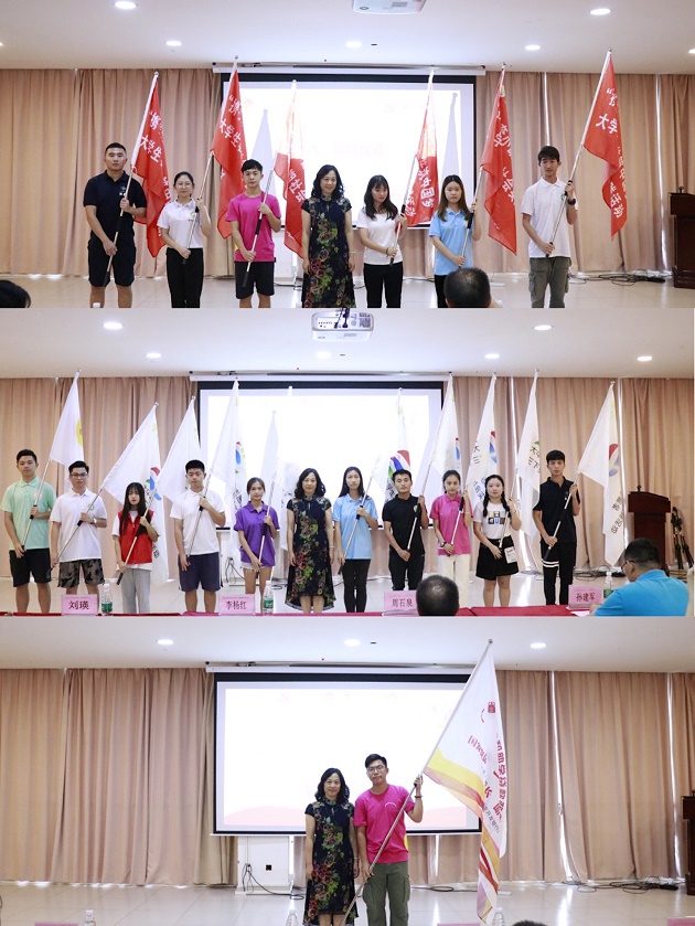 李杨红副书记依次为“携手奔小康,共筑中国梦”大学生暑期社会实践队伍、2019年广东省暑期文化科技卫生“三下乡”队伍、2019年“国家资助和助学贷款政策下乡行”队伍进行了庄严的授旗仪式。