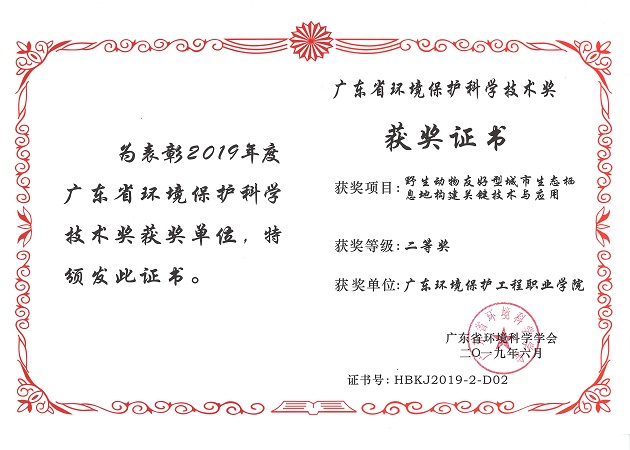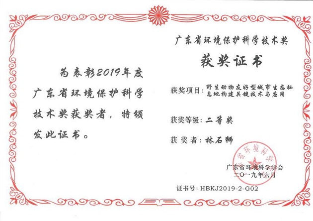 由我院与深圳园林股份有限公司、深圳中大环保科技创新工程中心有限公司、深圳市双花木生物科技有限公司、深圳市公园管理中心合作完成、共同申报的“野生动物友好型城市生态栖息地构建关键技术与应用”成果荣获2019年度广东省环境保护科学技术奖二等奖。我院为该成果的第二完成单位,林石狮老师名列获奖人第二位。该成果也是我院园林园艺专业“全国第二批现代学徒制试点”的项目内容之一。