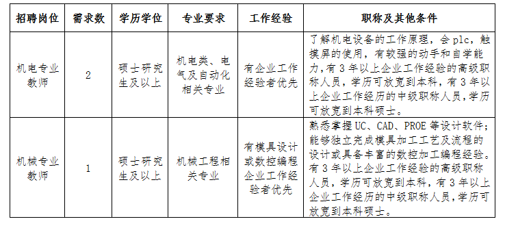 因工作需要,学院现面向社会招聘机电工程系教师3名。