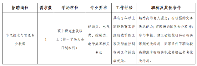 因工作需要,学院现面向社会招聘节电技术与管理专业教师1名。