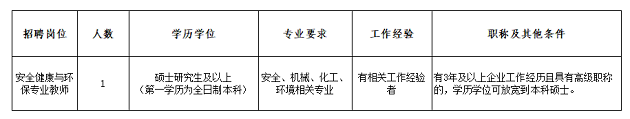 因工作需要,学院现面向社会招聘安全健康与环保专业教师1名。