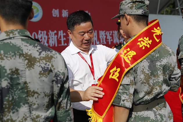 仪式上,孙水裕院长为各院系2020级退役复学新生代表佩戴了光荣花。按照国防部统一部署,学院征兵入伍工作不断扎实有序推进。今年,学院应征入伍报名人数共计574人,预定新兵160人。2020年退役复学学生39人。其中,石永峰等9名同学服役期间表现突出,在典礼上,作为退役复学新生代表,接受了学院颁发的光荣花。