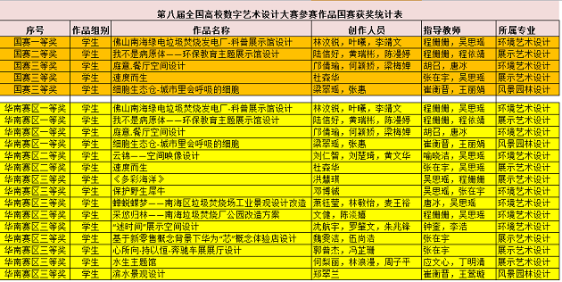 近日,第八届全国高校数字艺术设计大赛(NCDA)国赛、省赛成绩揭晓,我院人居环境学院(筹)环境艺术设计、展示艺术设计、风景园林设计专业联合参赛,由程珊珊、吴思瑶等十余位老师指导的学生作品,经过层层角逐,斩获佳绩,其中,国赛一等奖1项、国赛二等奖1项,国赛三等奖3项,并在华南赛区省级选拔赛获得一等奖4项,二等奖2项,三等奖9项。