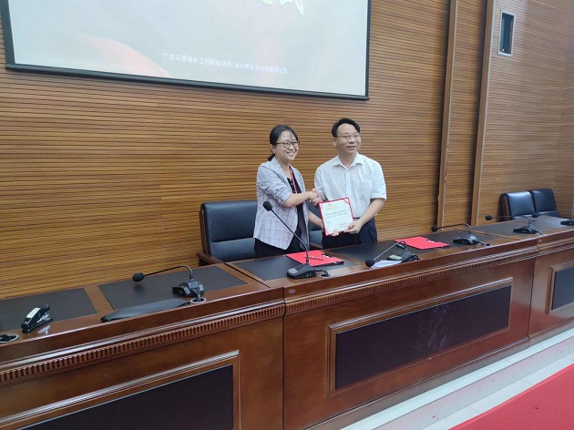 决赛现场,深圳市长隆科技有限公司向学院捐赠了本次大赛的主题产品,共计价值7万余元的“芬克智能快速检测仪”,为环院学子专业学习提供帮助。陈煜辉总裁,环境监测系主任郭璐璐代表校企签署捐赠协议。
