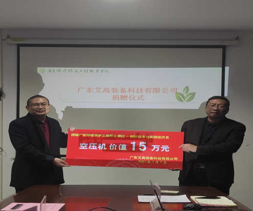 1月7日,广东艾高装备科技有限公司一行来我院交流,并向我院捐赠价值15万元的空压机实训设备。我院在招生就业指导办会议室举行捐赠仪式,学院副院长奚创旭、艾高装备科技有限公司制造中心总监余承雄一行、招生就业指导办公室主任彭江颖、循环经济与低碳经济系主任徐娟、副主任李可等参加了会议。