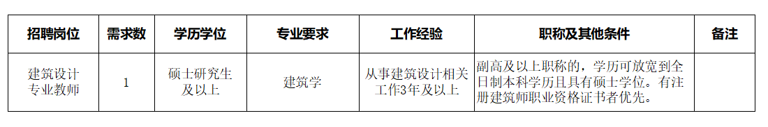 因工作需要,学院现面向社会招聘建筑设计专业教师1名。