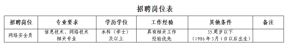 因工作需要,学院现面向社会招聘网络安全员1名。