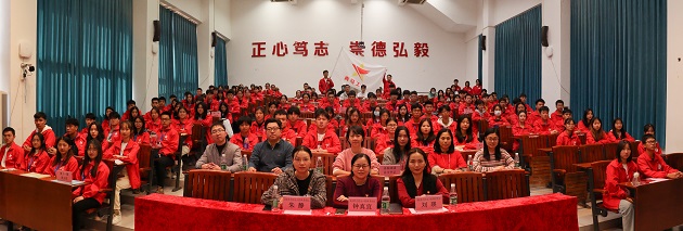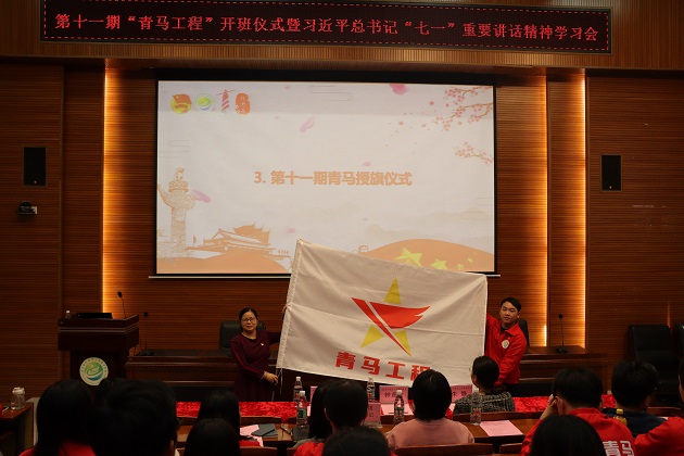 钟真宜讲话,对第十期青马学员顺利结业表示热烈祝贺,同时对第十一期所有青马学员提出三点要求:一是强化理论武装,坚定理想信念;二是强化使命担当,增强干事本领;三是强化服务意识,当好青年表率。第十一期学员代表佘雪娇在发言中表示,将会努力学习马克思主义理论,进一步加强政治修养,树立服务同学的理念。随后钟真宜为第十一期青马培训班授旗。