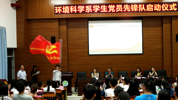 2015年5月4日晚上,环境科学党支部组建的环境科学系学生党员先锋队正式启动,院党委书记陈文韬同志、院党委办公室副主任周石泉同志、学生工作处副处长张朝清同志、院团委副书记刘瑛同志,以及各系党员师生代表,环科系学生党员、积极分子和14级全体团员参加了本次启动仪式,此次会议由支部组织委员尹思炜主持。