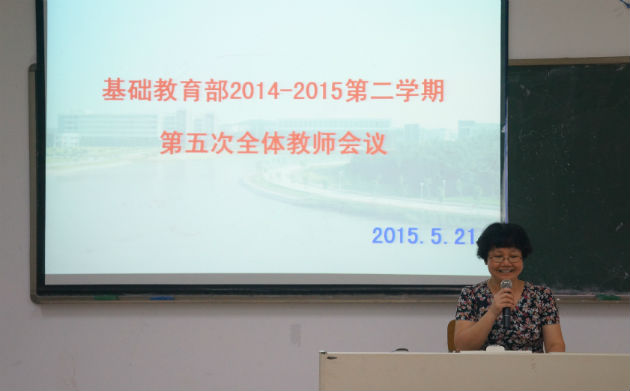 2015年5月21日下午,新上任的谢雯主任主持召开了基础教育部本学期第五次全体教师会议。会议的主要内容包含了迎评动员、系部近期工作安排、系部未来教学发展设想三项。
