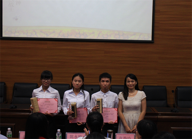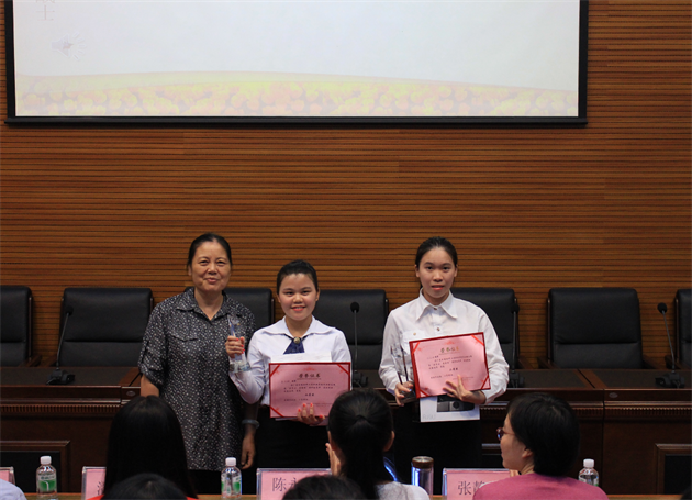 团委刘瑛副书记为罗文增、陈铭佳、黄伊淇 同学颁奖(三等奖)