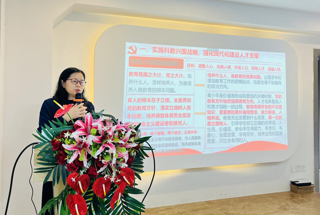 钟真宜以《新时代 新征程 深刻领悟“五个牢牢把握” 努力推动生态环境职业教育高质量发展》为题,从党的二十大报告的基本框架和主要内容、学习贯彻党的二十大精神 深刻领悟“五个牢牢把握”、落实立德树人根本任务 推动生态环境职业教育高质量发展三个方面进行讲授。她带领大家一起从战略定位、大会主题、实践基础、理论指导、基本路径、政治保证、团结要求等七个方面学习了党的二十大报告重要内容。结合学校实际和学习体会,系统阐释和深入解读了办好人民满意的教育、职业教育、生态文明建设等方面的战略部署和目标任务。她强调,要服务于人的全面发展,落实立德树人根本任务,促进学生德智体美劳全面发展;要服务于经济社会绿色发展,主动增强职业教育适应性,为推动绿色发展,建设人与自然和谐共生的现代化贡献应有的职教方案和智慧力量。