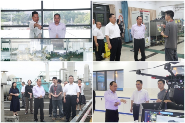 韩安贵一行首先参观了学校沙盘,环境工程虚拟仿真实训室、水处理竞赛实训室、废气处理实训场、无人机实训室、创新创业街等地现场