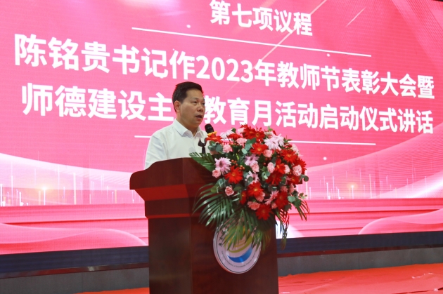 陈铭贵作了题为《强化党的创新理论武装,躬耕教坛潜心立德树人》讲话。陈铭贵首先代表学校党委向全体教职工致以节日的问候,向受到表彰的先进集体和优秀个人表示热烈的祝贺。希望全校教职工要以受表彰的集体和个人为榜样,对标对表,创先争优,始终心怀国之大者,牢记初心使命,在办好党和人民满意的职业教育、推动学校事业高质量发展中再创佳绩、再立新功。