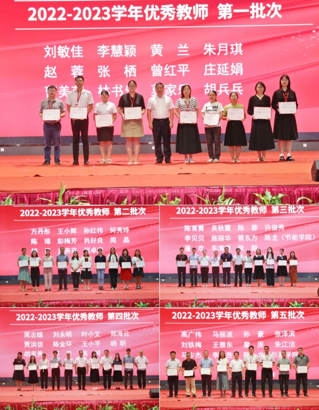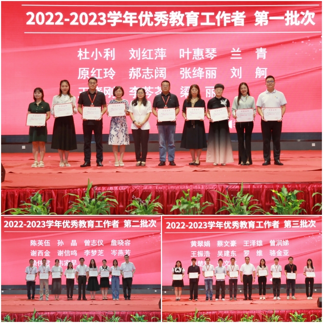 大会在庄严的国歌声中拉开帷幕。大会对2022-2023学年度先进集体、优秀教师、优秀教育工作者、第二届师德标兵以及获省部级以上荣誉的部分教师代表进行了表彰。校领导分别为6个先进集体和102名优秀个人颁奖。会场气氛热烈,掌声雷动。