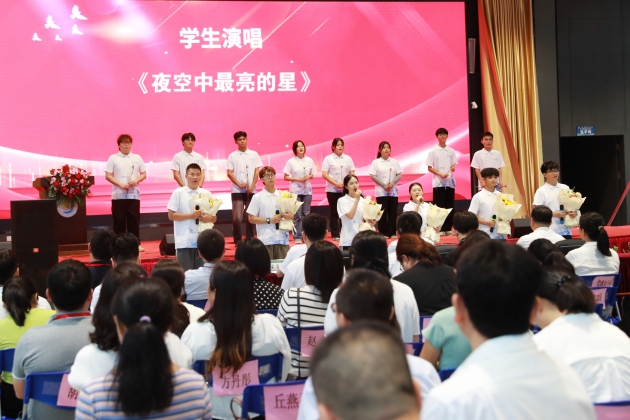大会最后,学校工会和团委把精心准备的特别节目献给全体教职工。教职工代表献唱了歌曲《奉献》,表达了对教育事业的执着坚守、对学校的深情厚意;学生代表合唱《夜空中最亮的星》,表达了对全体教职工的感激之情、对学校的真挚祝福。