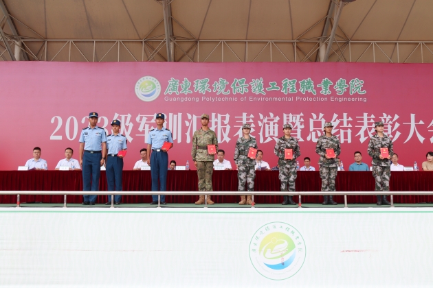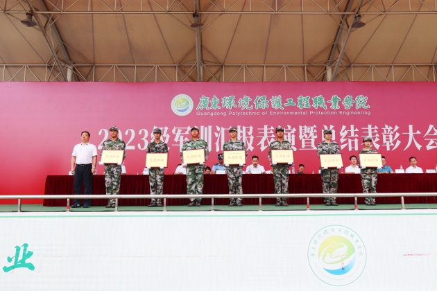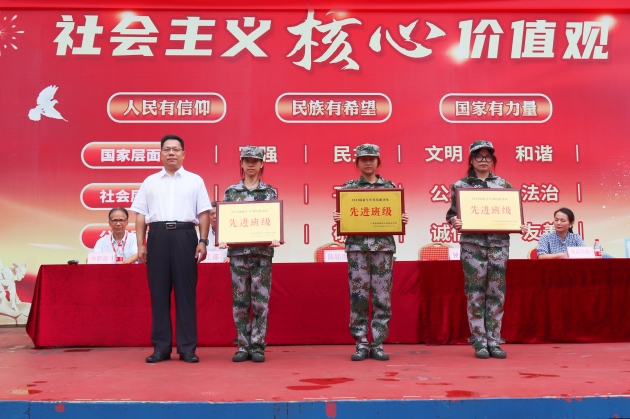 校领导及军训负责人为获奖集体、先进班级代表、军训标兵代表、优秀教官代表颁发牌匾、证书。