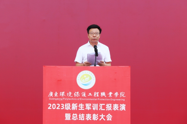 钟真宜代表学校作军训工作总结,向承训部队、全体承训教官和老师表示感谢,向圆满完成军训任务的全体同学表示祝贺,并希望同学们将军训中涵养出来的政治品格、顽强毅力、优良作风、奋斗精神延续下去,怀抱梦想又脚踏实地,敢想敢为又善作善成,始终秉承“厚德、精业、创新、有为”的校训,刻苦学习,强健身心,全面发展,立志做有理想、敢担当、能吃苦、肯奋斗的新时代好青年,奋力谱写属于环院优秀学子的青春华章。