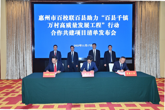 11月17日,惠州市百校联百县助力“百千万工程”行动合作共建项目清单发布会召开。省“百千万工程”指挥部办公室副主任毛永天、省教育厅副厅长程大欣、惠州市委书记刘吉出席活动并讲话,惠州市长温金荣主持活动。开云党委书记陈铭贵与暨南大学代表、结对对象博罗县代表共同确认合作共建项目并签名发布。