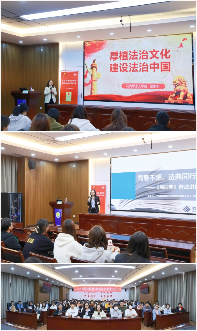 “宪法宣传周”期间,开云还组织开展了系列特色活动。12月4日上午,人居学院组织了学生代表在升旗仪式上诵读宪法部分条款。12月7日下午,马克思主义学院梁凯昕老师和广东君信经纶君厚律师事务所律师饶萍优分别以“厚植法治文化,建设法治中国”“青春不惑,法典同行”为题,面向学生开展了两场专题讲座。马克思主义学院还组织开展法治微电影比赛等多元化活动,营造尊法学法守法用法的浓厚氛围,弘扬宪法精神,维护宪法权威,深植宪法法律至上的理念。(文/图 马克思主义学院)
