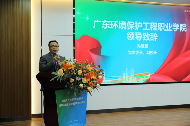 大会的主题为“加速双碳专业人才培养,推动国家双碳战略实施”。会上,全国智慧环保行业产教融合共同体秘书长、广东生态环境职业教育集团秘书长、学校副校长冯定坚、广东省广业检验检测集团有限公司党委委员、副总经理曾寿龄先生以及中量工程咨询有限公司市场部总监钟丽丽女士分别致辞。