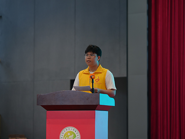 校青志“绿美·有为”生态环境志愿服务队成员黄英杰发言号召大家加入志愿服务行列,践行“奉献、友爱、互助、进步”的志愿者精神,共同推动绿色生活方式,为建设美丽中国贡献青春力量。
