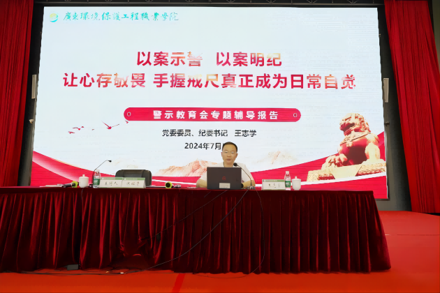 7月5日下午,学校召开党纪学习教育警示教育会。党委书记陈铭贵主持会议,传达习近平总书记关于全面加强党的纪律建设的重要论述,党委委员、纪委书记王志学通报警示教育案例,深入剖析,以案说德、以案说纪、以案说法、以案说责,会议还邀请了广州新华监狱党委书记、监狱长陈勇军上警示教育课。学校党委委员、纪委委员、中层干部;各党总支部、支部书记,纪检委员;各部门内设机构科室负责人;人力资源部、总务后勤部、财务部、招生就业办、对外服务部门、纪检室全体人员参加会议。