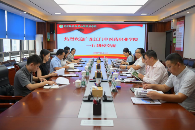 赵斌对学校的热情接待表示感谢。他介绍了广东江门中医药职业学院的专业设置、人才培养、师资队伍等方面的情况。南药与食品研究院院长彭荣珍介绍了研究院的基本情况。赵斌指出,两校在办学方面各有优势和特色,此次交流,进一步增进学校间的友谊,拉近距离,也为两校研究院所搭建沟通的桥梁,加强信息的互联互通,共赏互鉴,携手共进。