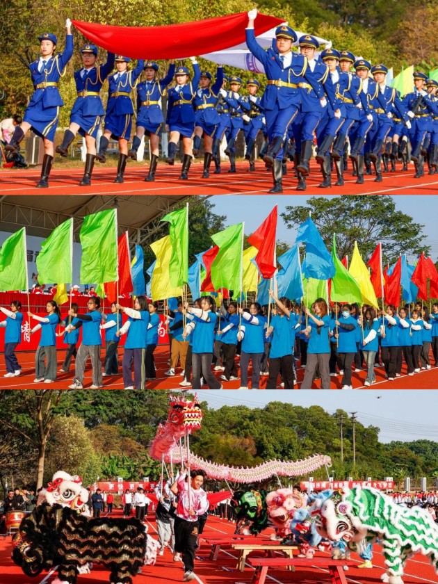 12月19日上午,运动会开幕式举行。伴随着激昂的运动员进行曲,国旗、校旗、会徽、彩旗、龙狮队、裁判员队伍、各二级学院方队、教工代表方队共12个方队依次走过主席台接受检阅。各二级学院表演精心组织且主题鲜明的文体节目,展示当代大学生积极进取和良好的精神面貌。