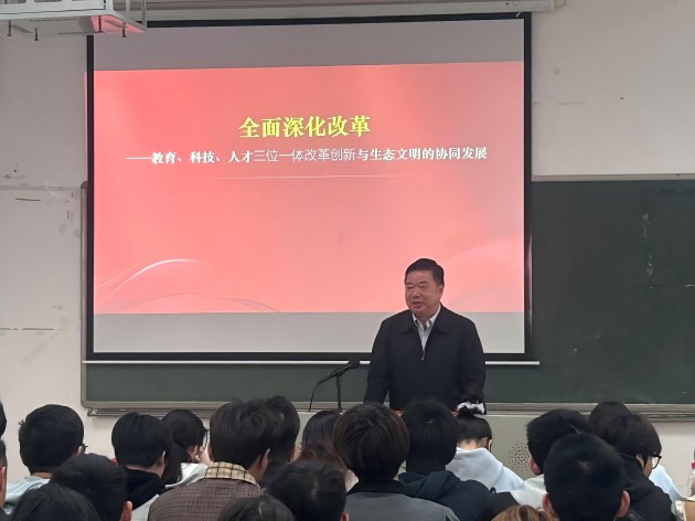 孙水裕讲课中引经据典,结合自身成长经历,以翔实的数据和生动的案例,围绕如何实现“三位一体”改革创新与生态文明的协同发展,从“改革历程概述”、“教育、科技、人才三位一体改革创新”、“改革推进生态文明建设”三个方面,回顾了改革开放波澜壮阔的历程,系统梳理了党的十八大以来全面深化改革取得的辉煌成就。他强调全面深化改革需要凝聚全社会的智慧和力量,鼓励学生按照能工巧匠、大国工匠、高技能人才的标准严格要求自己,树立生态文明的使命感与责任感,引导学生将个人成长与国家战略、全球可持续发展紧密结合。