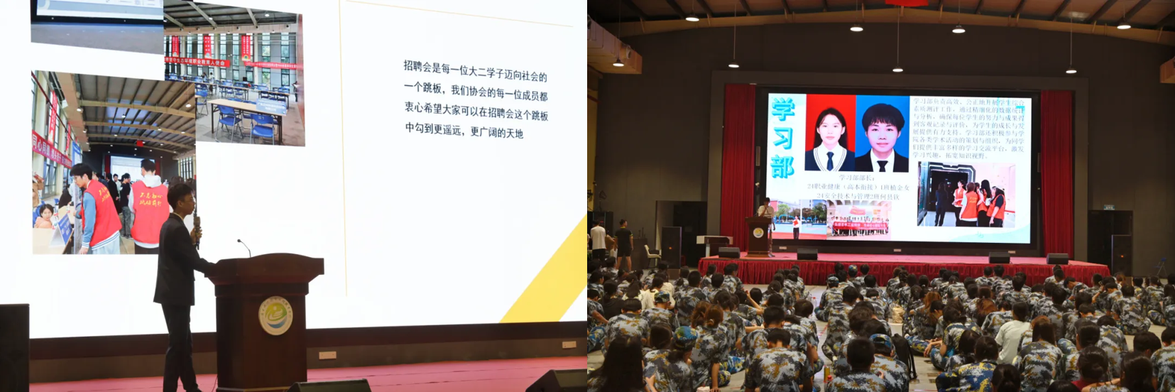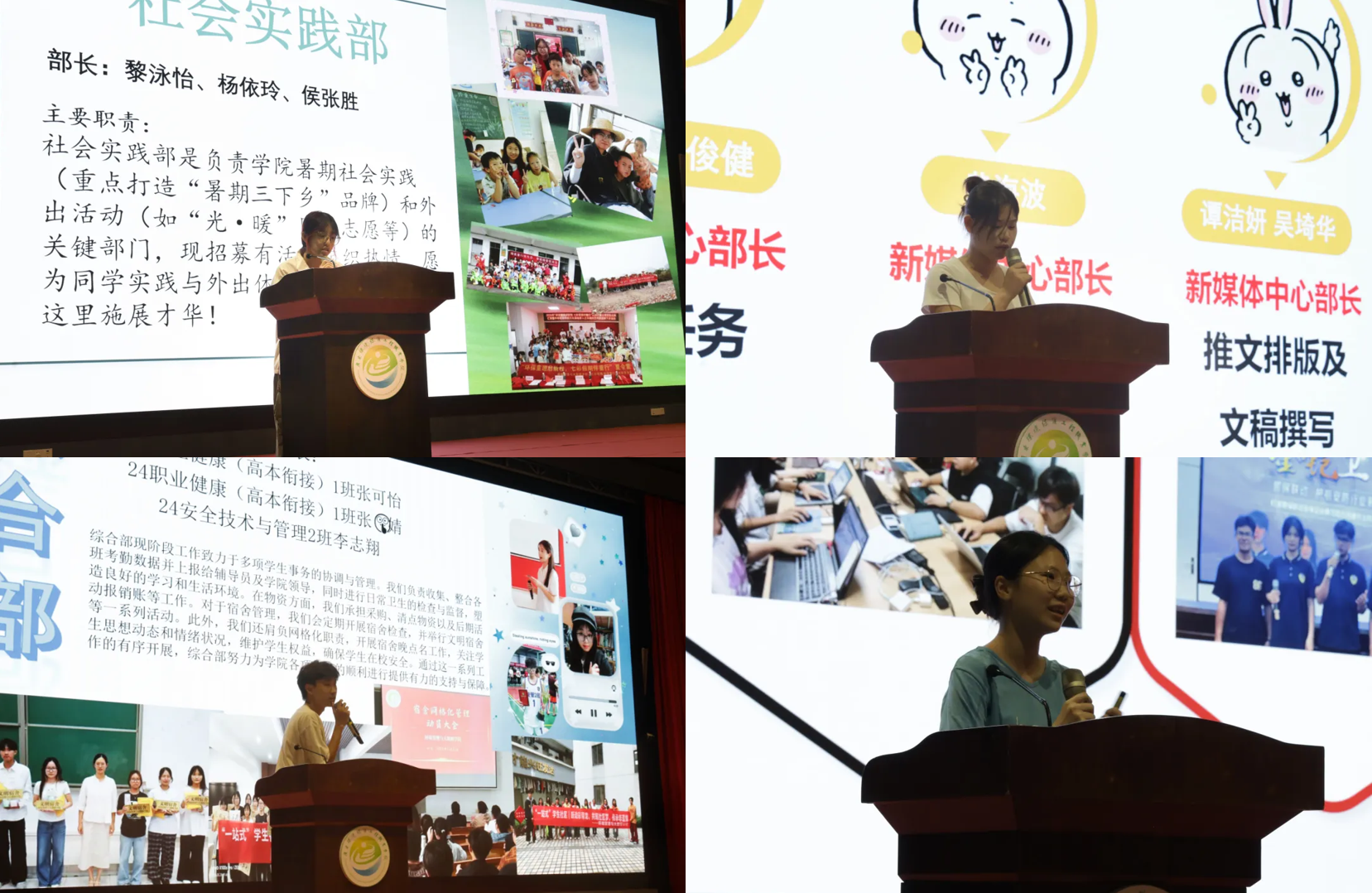 学生社团是新生拓展兴趣、提升能力的重要平台。最后,学院新媒体中心、团委学生会、心理健康联合会、创融赋能中心等学生组织代表依次上台,介绍各组织的职能定位、特色活动与招新计划。从校园文化活动策划到学术实践项目开展,从心理健康服务到创新创业支持,各组织充分展示活力与风采,鼓励新生根据兴趣特长积极参与,在社团实践中拓展社交圈、提升综合能力,实现全面发展。