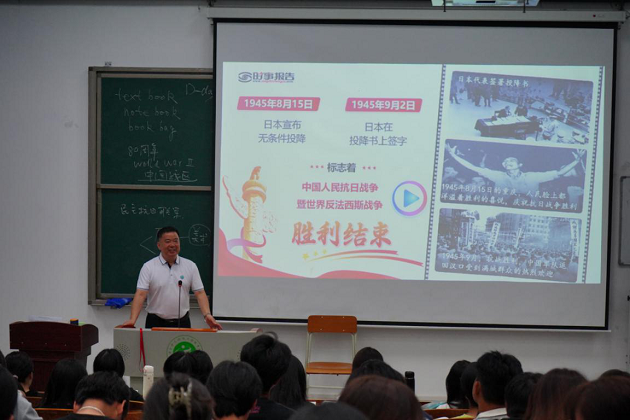 孙水裕校长从“铭记历史·正义必胜”、“民族壮举·浓墨重彩”、“精神丰碑·永不磨灭”、“珍爱和平·开创未来”四个维度展开讲解。他系统梳理了中国人民抗日战争艰难曲折的14年历程,从1931年“九一八事变”局部抗战,到1937年“卢沟桥事变”全面抗战爆发,再到1945年日本无条件投降,详细解析了战略防御、相持、反攻阶段的关键战役与历史意义,强调中国共产党在全民族团结抗战中的中流砥柱作用,以及中国战场作为世界反法西斯战争东方主战场的重要地位。