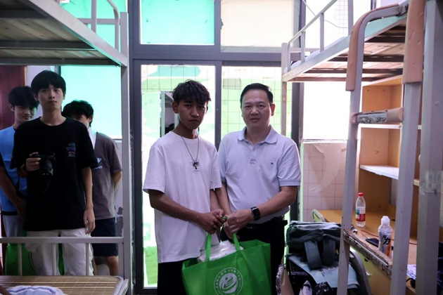 校长孙水裕一行亲临现场看望、慰问工作人员,与新生及家长亲切交谈。在“绿色通道”现场,校领导亲切慰问经济困难学生,勉励他们以校为家,安心学习,立志做新时代优秀大学生。副校长冯定坚代表学校为新生代表发放了爱心大礼包。