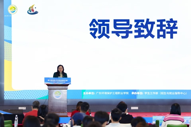 钟真宜在致辞中介绍了大赛举办的重要意义,回顾了学校在前两届全国职业生涯规划大赛中的成果和收获,强调学校将继续以大赛为契机,健全“全程化、全方位、多层次”的职业生涯教育体系,深化就业育人工作,为学生提供更优质、精准的生涯教育与就业指导服务。她勉励参赛选手和在校学生要立足所学专业,主动对接国家发展战略和经济社会发展需求,结合自身兴趣与能力特质,科学规划学业和职业,合理设定职业目标,积极投身学习与实践,不断提升岗位胜任力和就业竞争力,坚定自信地走好未来职业发展之路。