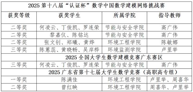 其中,在素有“小国赛”之称的第十八届“认证杯”数学中国数学建模网络挑战赛中,荣获二等奖3项、三等奖1项,指导教师团队由高广伟、陈敏娜、卢里举、陈本晶等教师组成。在全国大学生数学建模竞赛广东赛区比赛中,荣获广东省三等奖1项(指导教师:高广伟)。在广东省第十七届大学生数学竞赛(高职高专组)中,荣获一等奖1项、二等奖1项(指导教师:卢里举、周喜华)。