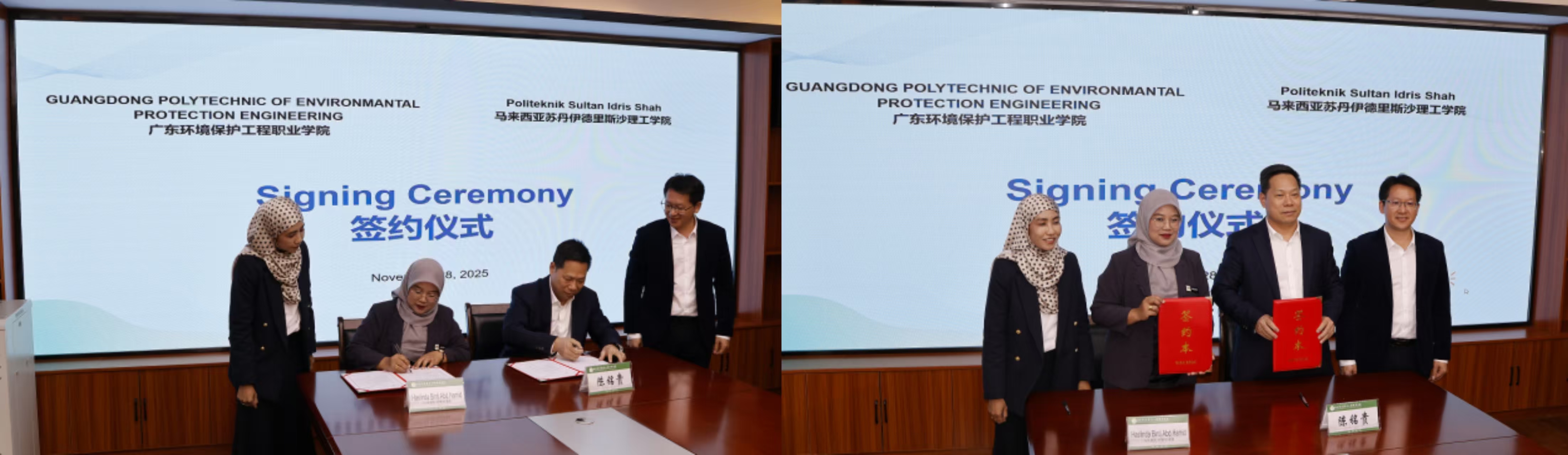 “环境工程技术友谊学院”签约仪式环节上,陈铭贵与哈丝琳达·阿都哈米德代表两校签署合作协议。