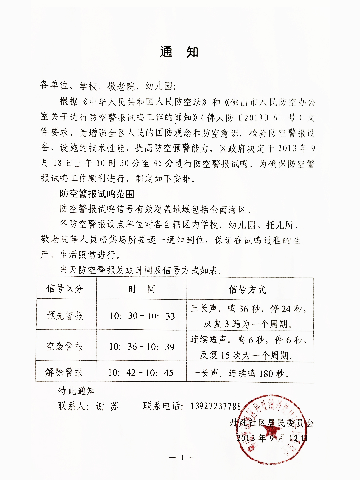 按照佛山市南海区丹灶镇丹灶社区居民委员会2013年9月12日下发的通知,根据《中华人民共和国人民防空法》和《佛山市人民防空办公室关于进行防空警报试鸣工作的通知》(佛人防〔2013〕61号)文件要求,为增强全区人民的国防观念和防空意识,南海区政府将于2013年9月18日上午10时30分至45分进行防空警报试鸣。现将有关事项通知如下: