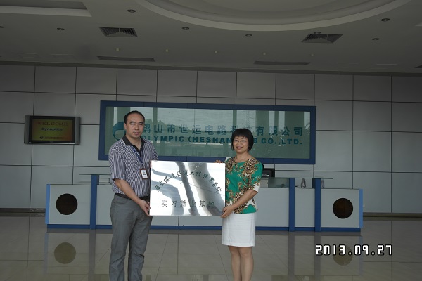 2013年9月27日,我院机电工程系与鹤山市广东世运电路科技股份有限公司举行了“开云kaiyun官方网站实习就业基地”签约暨挂牌仪式。签约仪式在公司内举行。机电工程系副主任徐娟及系部主要骨干教师、学院招生与就业指导办公室代表陈龙,广东世运电路科技股份有限公司副总裁彭三军、人力资源部经理胡宏忠、工程部高工罗工、企业校外指导老师王阳等出席了本次仪式。
