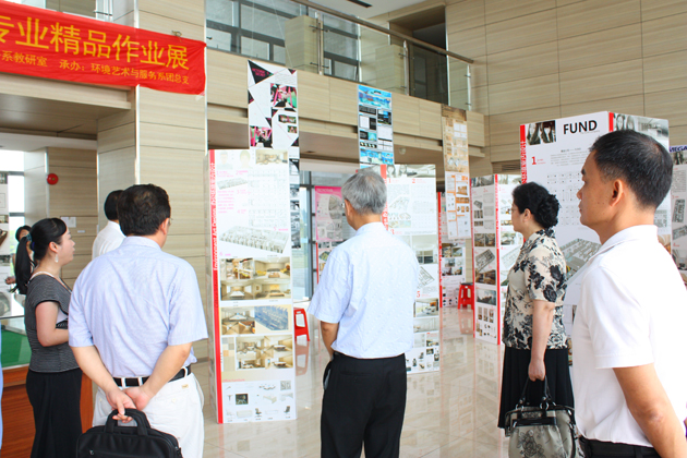7月7日上午,在陈英院长的带领下,前来我院考察并出席相关活动的广东致公党省委主委王珣章、省环保厅李晖副厅长、汕尾市副市长刘小静等领导专门抽出时间参观了正在学院行政楼中庭举行的环境艺术设计专业精品作业展。领导们被学生精彩的作业展板所吸引,仔细驻足观看。环境艺术与服务系喻晓洁副主任代表环服系师生对宾客的到来表示热烈欢迎,并详尽介绍了环艺专业办公空间设计课程及展示空间设计课程特色。李晖副厅长对环艺专业学生的作业水平给予了肯定,并热情鼓励师生们再接再厉,创作出更多更好的作品。