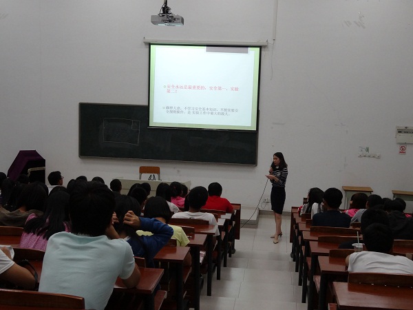 2014年10月15日、16日晚上七点,实训中心化学检验实训基地和环境监测实训基地成功举办5场化学类实验室安全知识讲座。主讲人分别是郭加会、李珍、谢月莹三位老师。讲座主要面向有化学类实验实训的大一新生,共吸引了1000多名学生前往学习。